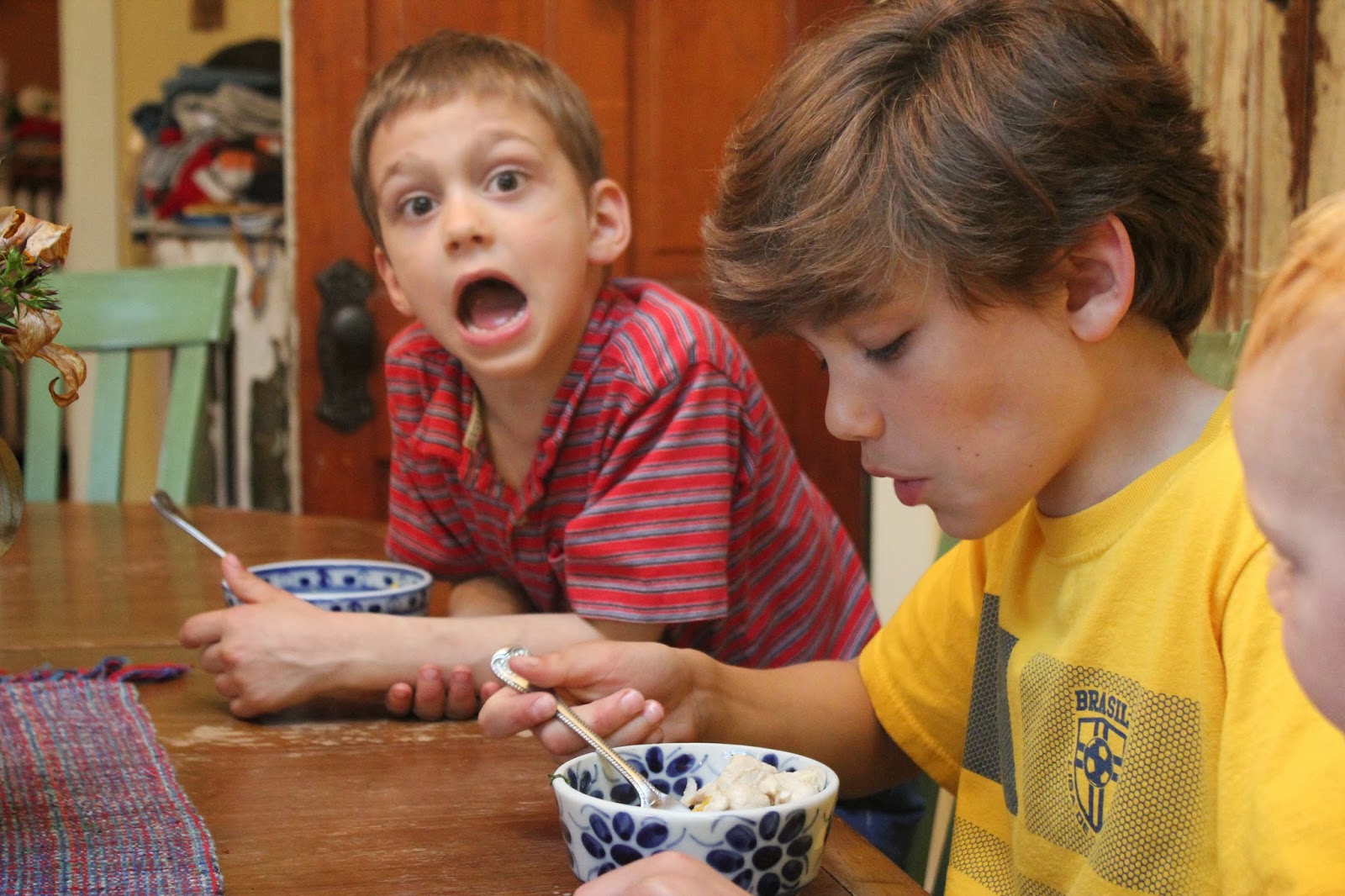 Mealtime is another assault on physical and air space. The volume at the table is deafening. All my children are storytellers and expand on one another's stories, with hilarious theatrical imitations; children call for food; someone spills a glass of water; younger ones need to be coaxed to eat vegetables. Recently, my two year old kept calling, "please pass the butter...please pass the butter..."over and over. Finally, unattended, he stood up on his seat, took his glass of water and held it over his brother's head, saying, "Ellison, look in my eyes. If you don't pass the butter, I pour this on your head." So much for a civil and polite meal.