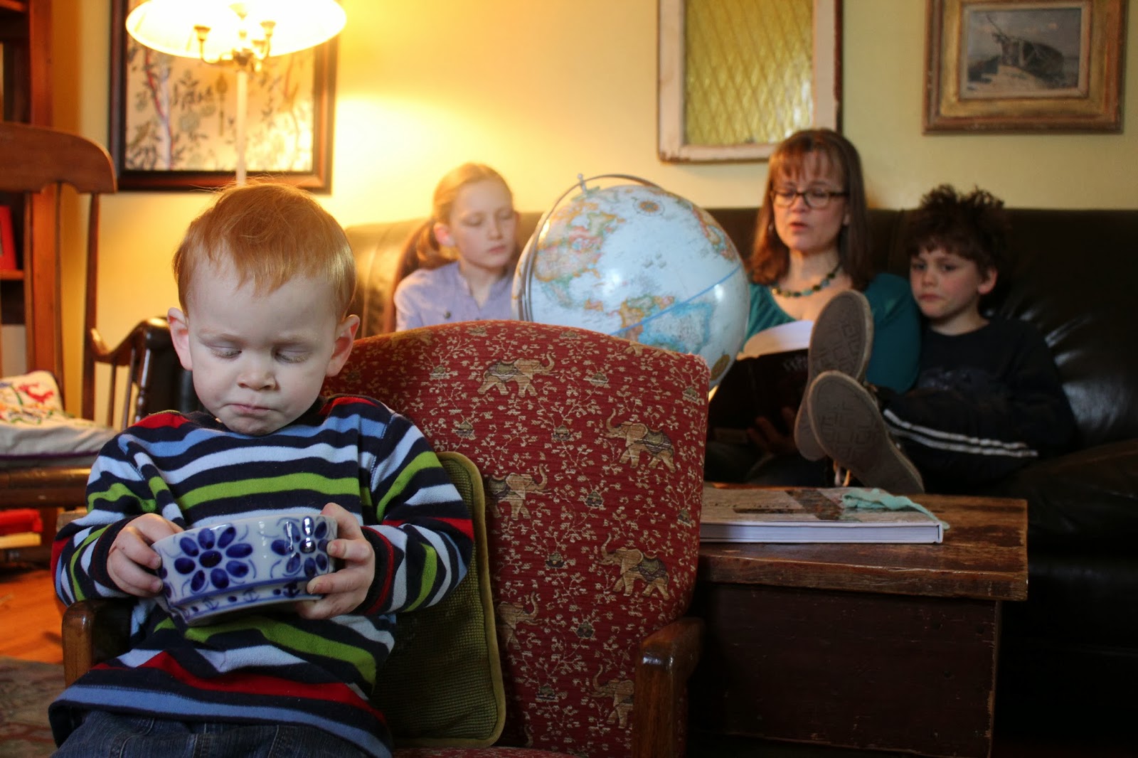 One would think such life preparation would make me easy with six children in a relatively small house. But I still find my patience exhausted, and my expectation for space only expanded. When I sit on the couch to read to my children, I imagine a cosy read with a living book, maybe everyone sipping a hot drink under hand knitted throws. Instead I must endure ten minutes of arguing over seats--those who need to read along over my shoulder up against those who don't like feet touching them and squabbling with the ones who never get to be right next to me. Then there is the settling in, then the heavy leaning against my side, and someone lying behind me on the top edge of the sofa. The baby comes up and decides that nursing right now would be the cosiest conclusion to this happy scene, and once settled in, kicks the child on one side while pinching the face of the one on the other. How I am tempted to give up, though I know this is worth making happen.